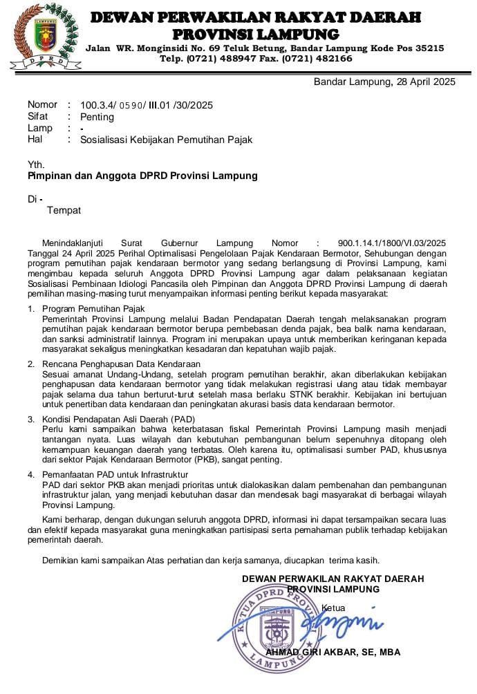 Imbauan ini disampaikan Ahmad Giri Akbar dalam surat DPRD Lampung, Nomor 100.3.4/0590/III.01/30/2025 terkait Sosialisasi Pemutihan Pajak.