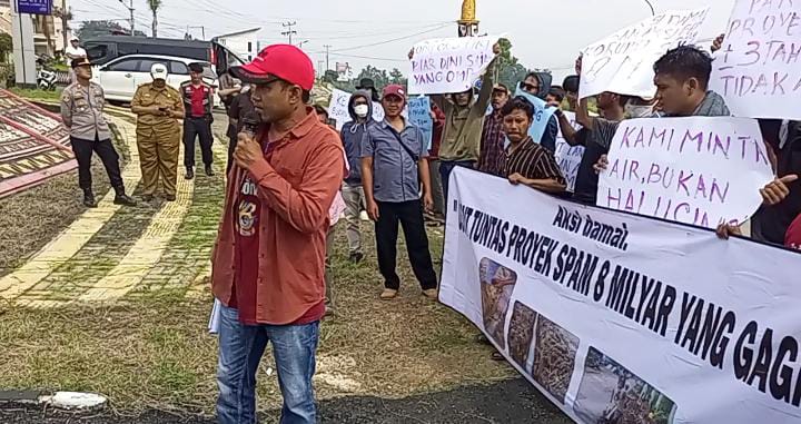 Ratusan warga yang tergabung dalam aksi unjuk rasa mendatangi Kantor Kejaksaan Negeri (Kejari) Pesawaran. Mereka menuntut aparat penegak hukum segera memeriksa proyek Sistem Penyediaan Air Minum (SPAM) yang dibangun pada tahun 2022 dengan anggaran fantastis sebesar Rp8 miliar, namun hingga kini tidak memberikan manfaat bagi masyarakat, Senin 14 Juli 2025.