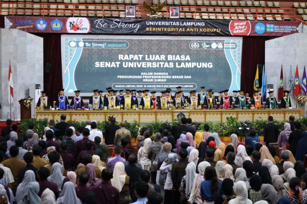 Bandarlampung – Universitas Lampung (Unila) menggelar rapat senat luar biasa dalam rangka pengukuhan guru besar dan penyampaian orasi ilmiah, pada Senin, 26 Januari 2026, di Gedung Serbaguna (GSG) Unila.